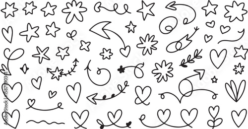 "Romantic Hand Drawn Doodles – Vector Hearts, Crowns, Arrows, Stars, and Cute Sketches in Black Line Art – Great for Social Media, Posters, Love Themes, Printable Art, and Stickers"