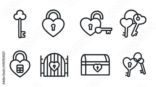 Romantic heart outline icons set – linear, love, key and lock graphics