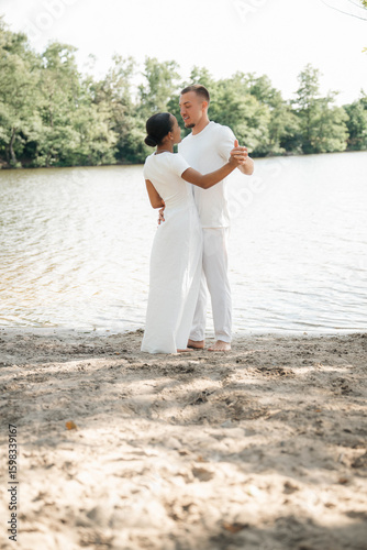 Romantic Interracial Couple Dancing Barefoot on Beach by the Lake, Wearing White Clothes, Smiling and Enjoying Summer Day Outdoors, Love and Togetherness in Nature