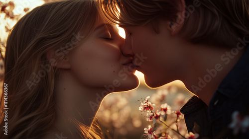 Romantic Kiss at Sunset Amid Spring Blossoms – Love and Nature in Golden Hour