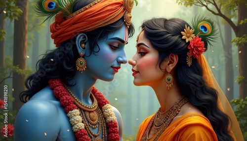 Romantic Krishna and Radha in traditional attire