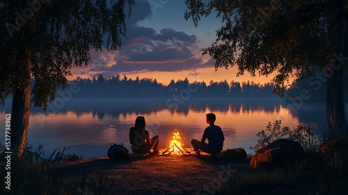 Romantic lakeside campfire at sunset, cozy evening for couple on nature