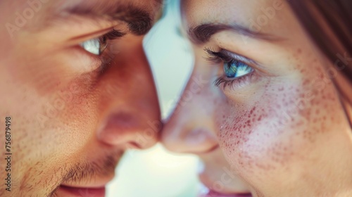 Romantic lovers. Happy young family couple smiling leaning heads close to one another whispering tender sincere confessions. Close up side shot of enamored boyfriend girlfriend faces with closed eyes