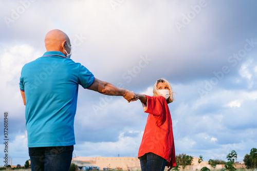 Romantic middle age couple in respirators and casual clothes holding hands and spinning while walking together in countryside during summer evening and looking at each other with love