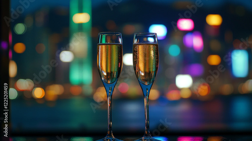 Romantic Night Cityscape Two Champagne Flutes Golden Hour Drinks Luxury Celebration Bar View Date