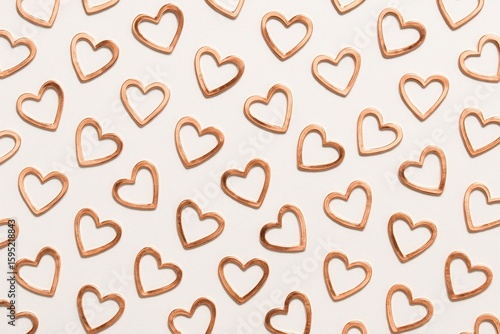 Romantic rose gold heart-shaped confetti scattered elegantly on pure white background for wedding celebrations