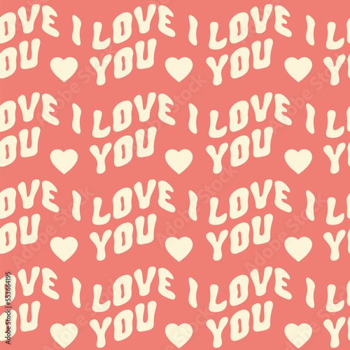 Romantic seamless pattern with wavy horizontal text I Love You on a red background. Retro vintage print in style 70s, 80s. Vector illustration