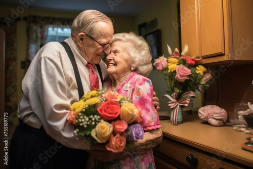 Romantic Senior man surprises wife with flowers. Happy romantic couple on valentines day. Generate Ai