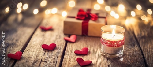 Romantic setting with candlelight heart decorations and a beautifully wrapped gift on rustic wooden table