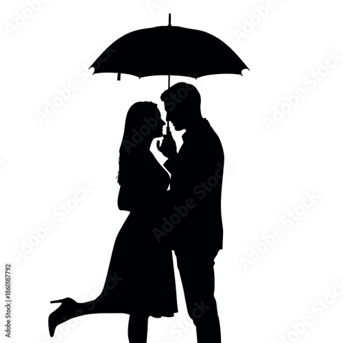 Romantic silhouette of a couple kissing under an umbrella