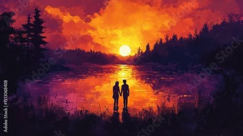 Romantic silhouette of a couple watching a vibrant sunset on a tranquil lake
