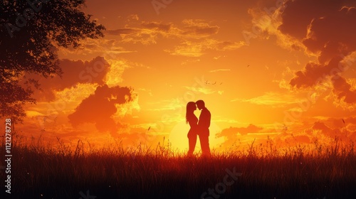 Romantic Silhouette of Couple Embracing at Sunset in Golden Hour with Dramatic Sky and Grass