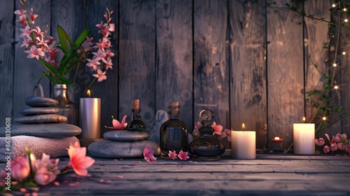 Romantic spa ambiance with essential oils massage stones and flowers in candlelight on a wooden backdrop
