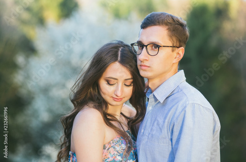 Romantic summer love story on a sunset in mountains. Young girl and boy in love. pregnant women