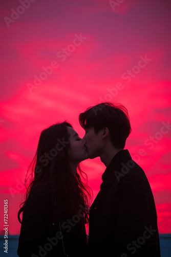 Romantic Sunset Kiss: Silhouetted Couple Embracing in Love