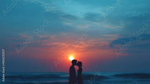 Romantic Sunset Silhouette of Couple Embracing by the Ocean Shore