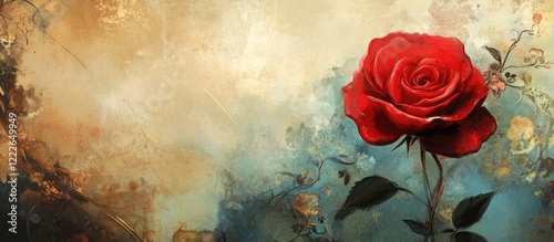 Romantic Valentine s Day card with vibrant red rose positioned right against a soft pastel background featuring blue and gold tones for love expression
