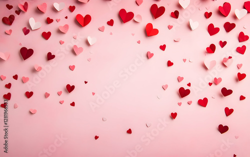 Romantic Valentine’s Day backdrop with scattered paper hearts over a soft pink surface