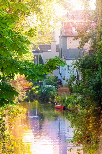 Romantic view of the canal with red boat in Bruges
