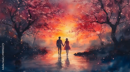 Romantic watercolor painting of a couple holding hands in a sunset-lit park with cherry blossoms