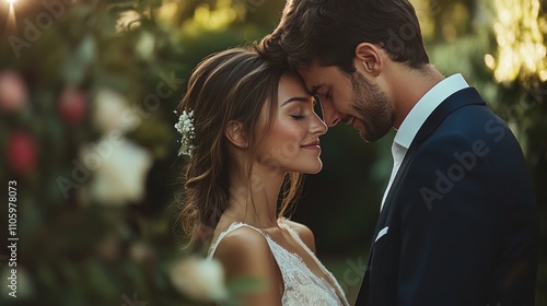Romantic Wedding Couple Forehead Kiss Garden Ceremony Bride Groom