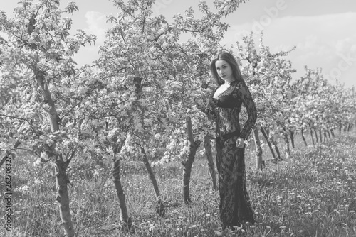 Romantic woman in lace dress at spring blossom garden. Concept of tenderness and modern femininity