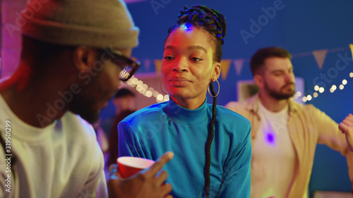 Romantic young fashion couple staying together at disco party, talking on lifestyle sharing fun stories enjoying each other and celebrating holidays.