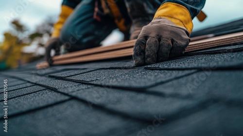 Roofer applying shingles on a residential roof. Featuring focus and craftsmanship