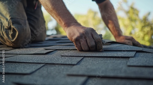 Roofer installing shingles on a new roof. Featuring precision and craftsmanship