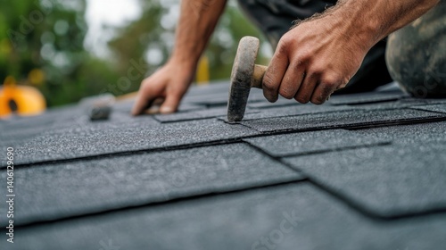 Roofing worker applying shingles to a sloped roof. Featuring durability and craftsmanship