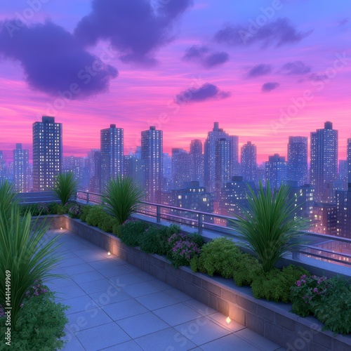 Rooftop Garden City Skyline Dusk Purple Pink Hues