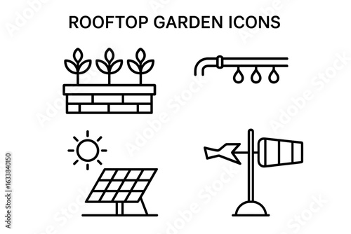Rooftop Garden Linear Vector Icons Set. Urban Agriculture Planter Box, Automatic Drip Irrigation, Solar Panel Energy, Wind Direction Gauge. Sustainable City Gardening Elements Isolated