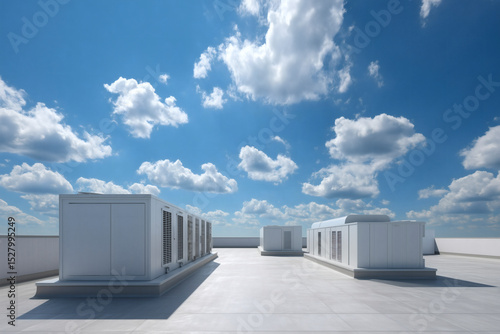 Rooftop HVAC units stand against a bright blue sky filled with fluffy white clouds, illustrating modern cooling.