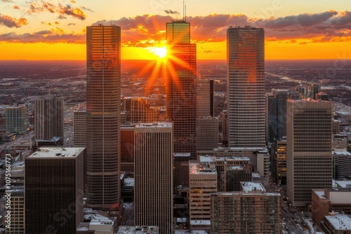 Rooftop view of a vibrant city at sunset, with skyscrapers glowing in golden light