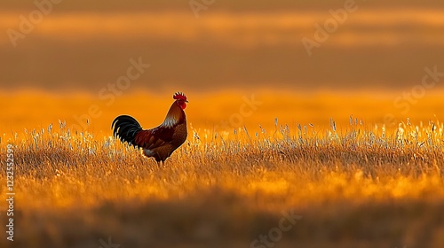 Rooster standing majestically in a golden field during sunset, nature's serene beauty