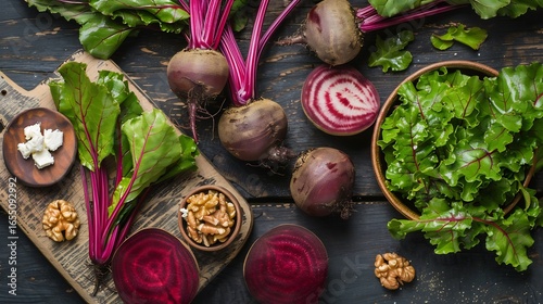 Root to Stem Beet Salad, roasted beets, sauted beet greens, goat cheese, walnuts, earthy tones, rustic plating, top down view