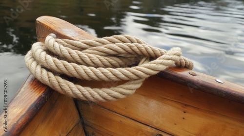 Rope coiled on the edge of a wooden boat resting by a tranquil lake shore amidst calm water reflections