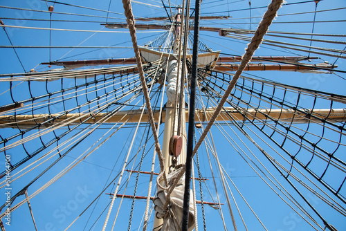 Ropes and the mast to control the sails, details of the device of the yacht, sailing ship equipment against the blue sky, horizontal view