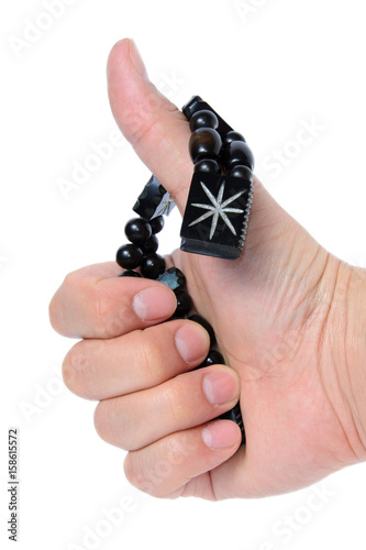 Rosary in hand on a white background isolated