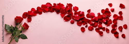Rose flower petals flat lay on pink background