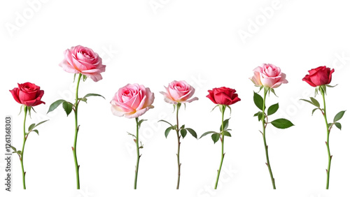 rose flower stems, with green leaves, are arranged on transparent background