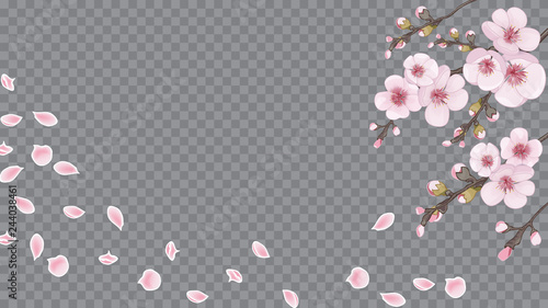 Rose on transparent background. Handmade background in oriental style. Festive frame of sakura flowers. The idea of fabric, invitations, packaging, cards.