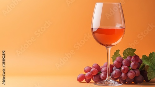 Rose wine glass and red grapes on orange background.