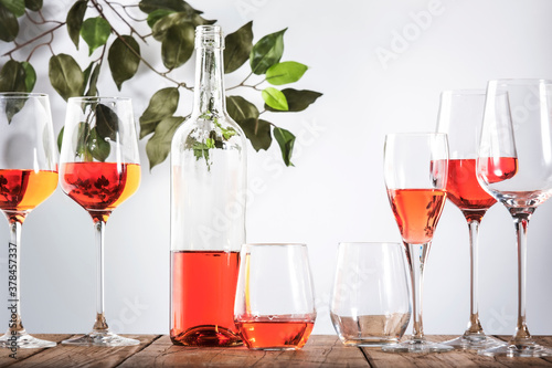 Rose wine glass with bottle on the white table. Rosado, rosato or blush wine tasting in wineshop, bar concept. Copy Space