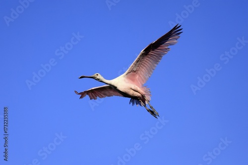 Roseate spoonbill (Platalea ajaja), adult, flying, St. Augustine, Florida, North America, USA