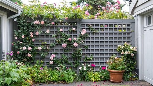 Rose-covered fence, backyard garden, blooming roses, idyllic scene, outdoor decor