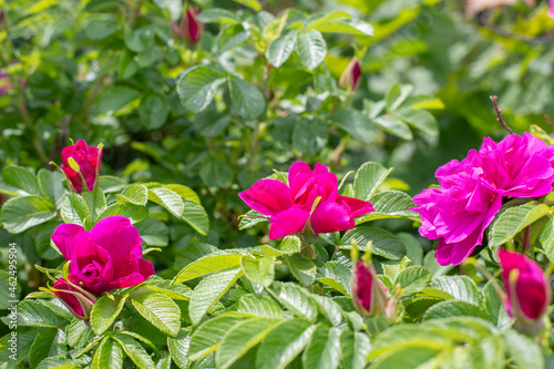 Rosehip blossom, pink opening flower. Bright summer natural background