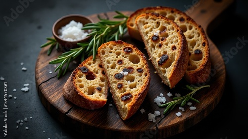 Rosemary and sea salt grilled bread slices on rustic wooden board