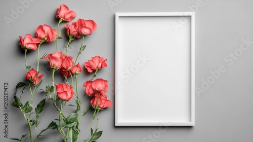 Roses arranged beside a blank frame on a grey background with copy space for text or design elements.