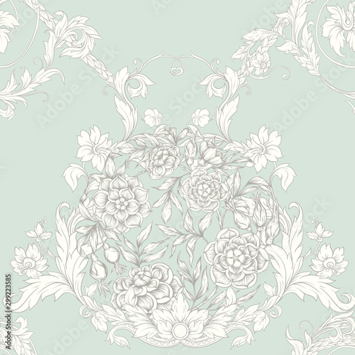 Roses Seamless pattern, background. Graphic drawing, engraving style. Vector illustration. In art nouveau style, vintage, old retro style